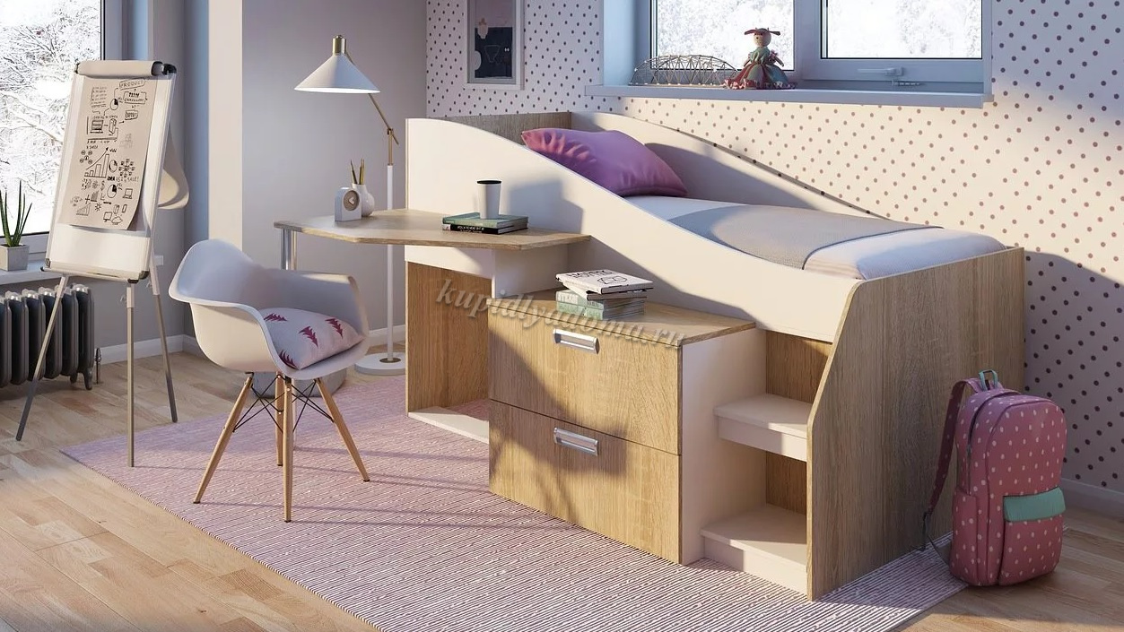 Европейский стиль и ультрамодное сочетание цветов в детской Скаут позволит поставить данную композицию в комнату как для мальчика, так и для девочки. При помощи декоративных элементов Вы легко обыграете детскую ребёнка, добавив комнате актуального именно ему настроения. Компактная композиция удачно впишется в небольшое помещение или уголок малыша. Удобная кровать, стол, выдвижные ящики – все эти элементы заняли минимум полезной площади комнаты, обеспечив при этом необходимую функциональность.