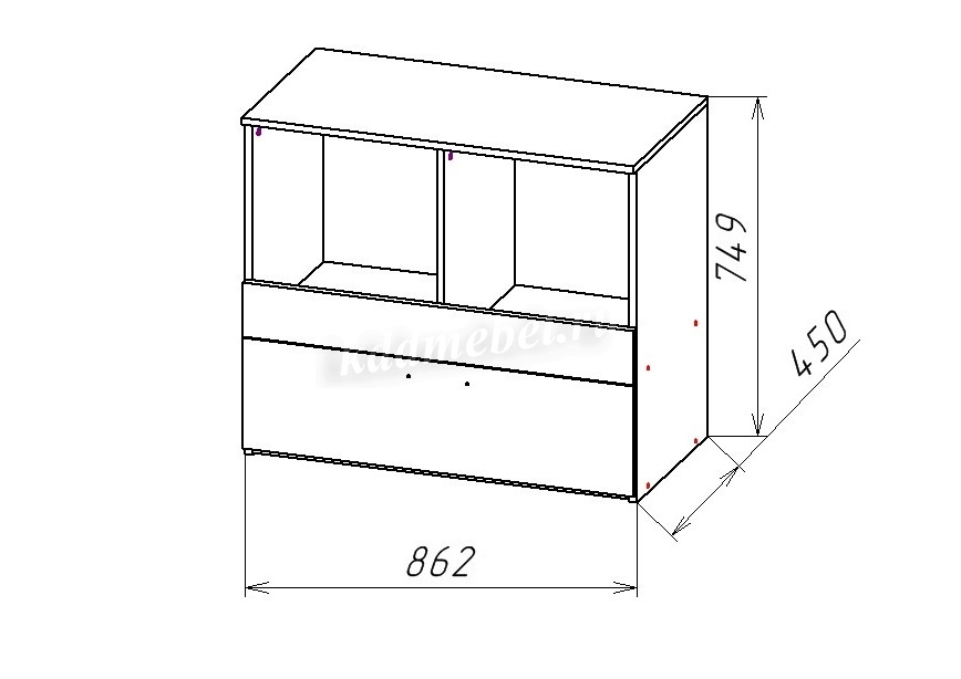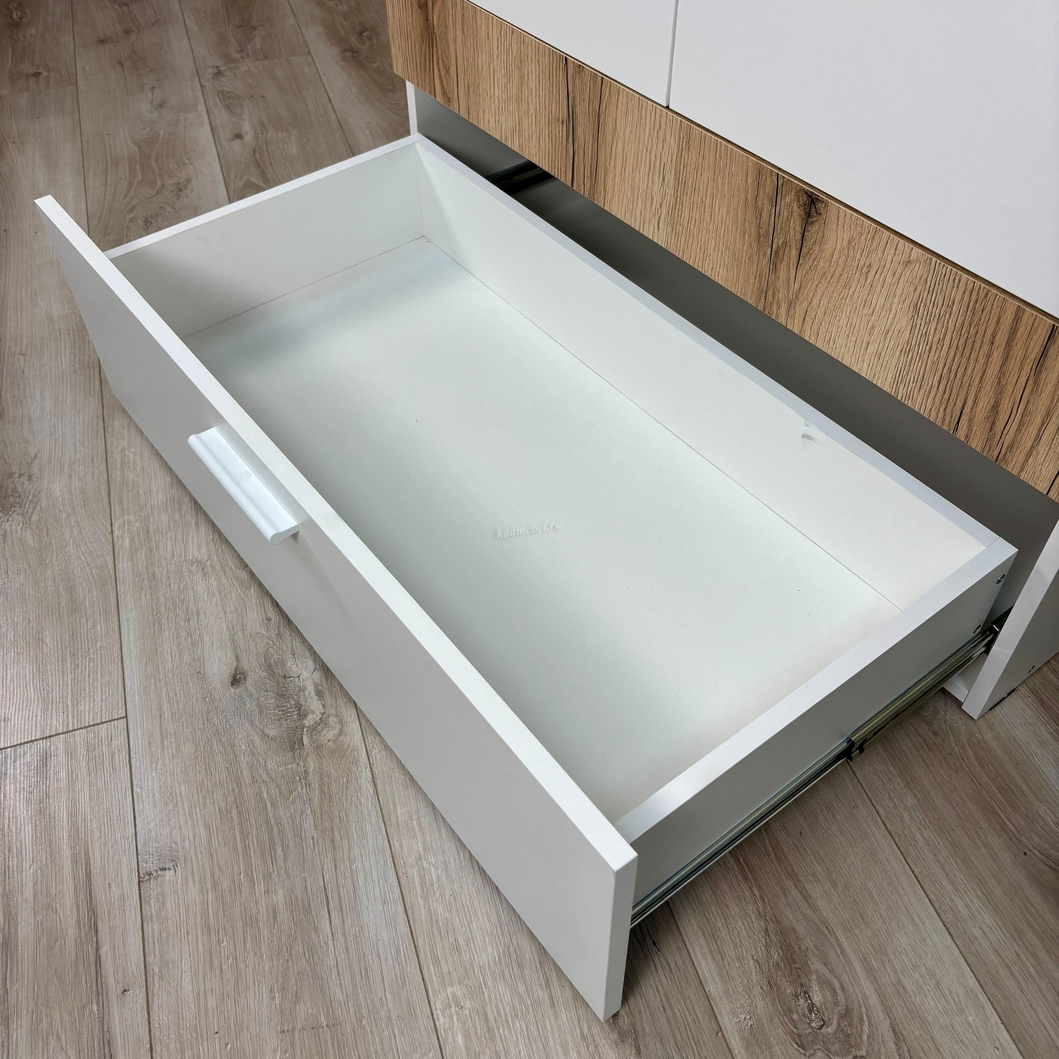 Комод с двумя дверками и ящиком. Направляющие НПВ шариковые. Ручки пластик, белые.