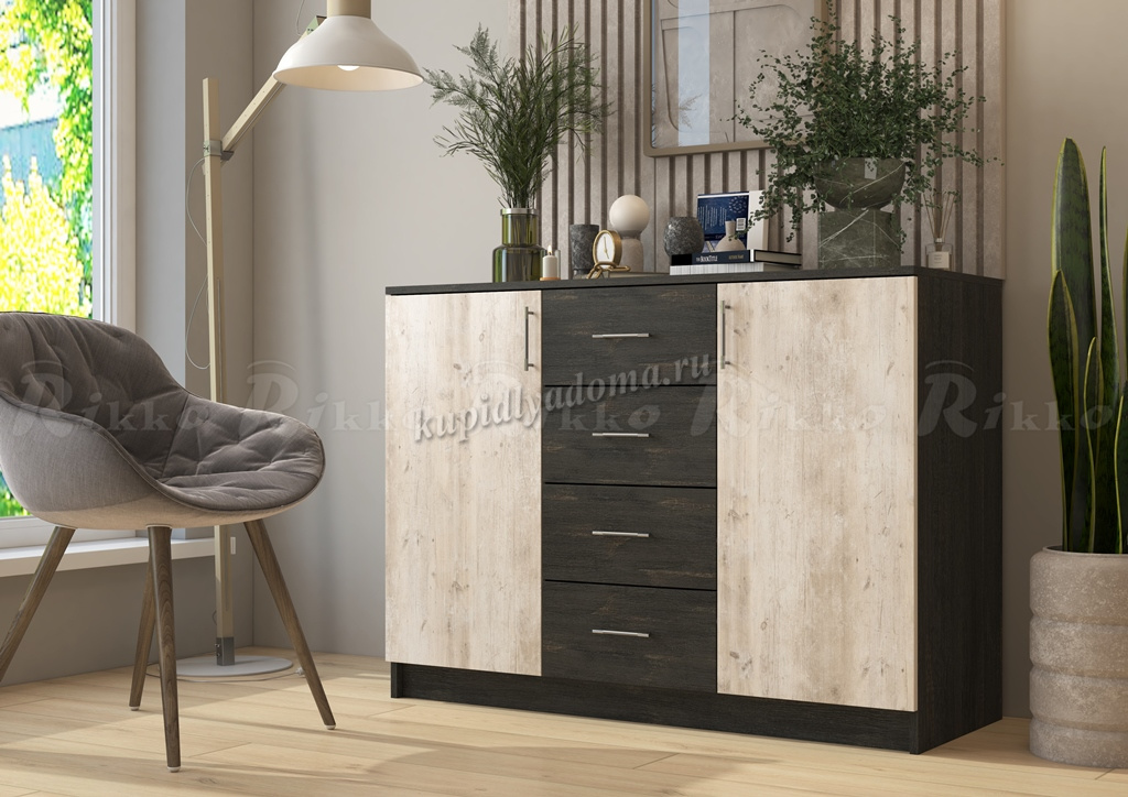 Комод имеет два больших отделения за распашными дверцами, разделенные внутри на 2 просторные полки. Посередине модели расположены четыре выдвижных ящика для разных мелочей. Дверцы открываются в сторону. Ящики выдвигаются на себя.