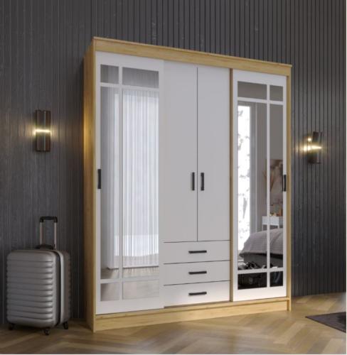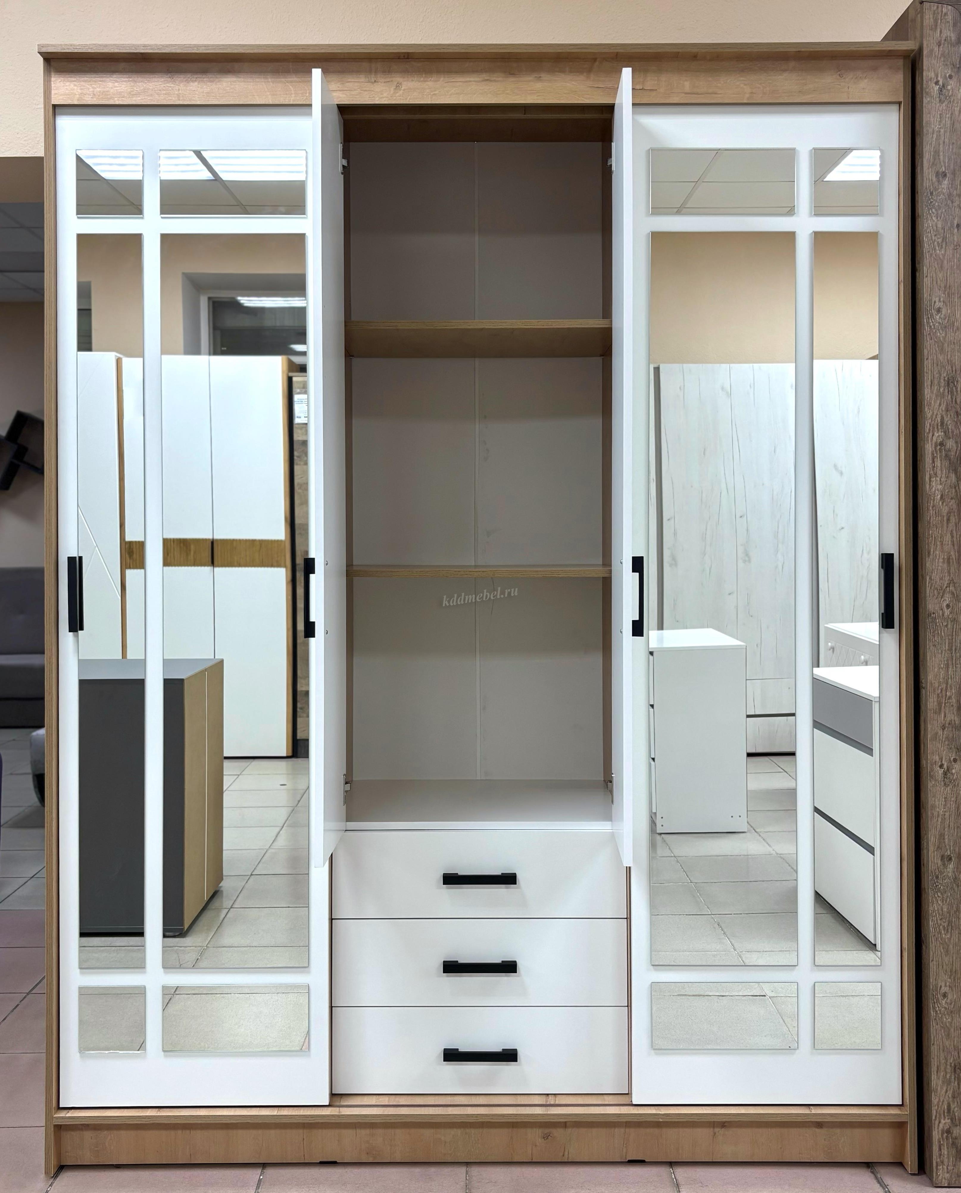 Удобный и вместительный шкаф-купе ЛОРД благодаря необычному дизайну хорошо подойдет интерьеру в любом стиле. Изюминкой шкафа являются оригинальные зеркальные фасады. Шкаф отлично будет смотреться в спальне или прихожей, добавляя помещению света. Два боковых отделения шкафа предназначены для хранения одежды и комплектуются антресольной полкой и 3 штангами. Центральное отделение в нижней части оборудовано тремя вместительными ящиками, верхняя часть с распашными дверцами комплектуется полками.