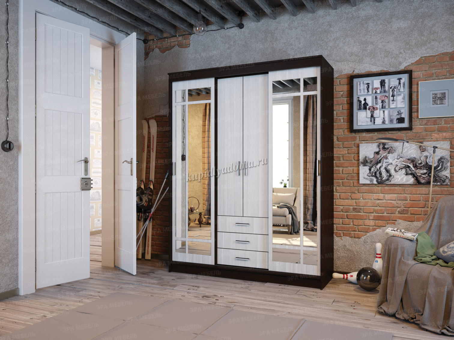 Удобный и вместительный шкаф-купе ЛОРД благодаря необычному дизайну хорошо подойдет интерьеру в любом стиле. Изюминкой шкафа являются оригинальные зеркальные фасады. Шкаф отлично будет смотреться в спальне или прихожей, добавляя помещению света. Два боковых отделения шкафа предназначены для хранения одежды и комплектуются антресольной полкой и 3 штангами. Центральное отделение в нижней части оборудовано тремя вместительными ящиками, верхняя часть с распашными дверцами комплектуется полками.